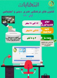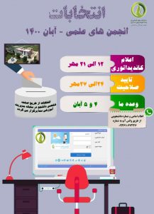 انتخابات کانون های فرهنگی و انجمن های علمی دانشجویی دانشگاه طی تاریخ ۴ و ۵ آبان ۱۴۰۰ به صورت مجازی از طریق صفحه شخصی دانشجو در سامانه مدیریت آموزشی سما برگزار می گردد. علاقه مندان جهت ثبت نام طی تاریخ ۱۲ مهر لغایت ۲۱ مهر ۱۴۰۰  از طریق شماره واتس آپ ۰۹۱۱۱۵۵۷۳۳۹ برای کانون های فرهنگی و شماره واتس آپ ۰۹۳۶۱۰۶۷۴۴۶ برای انجمن های علمی اقدام نمایند.