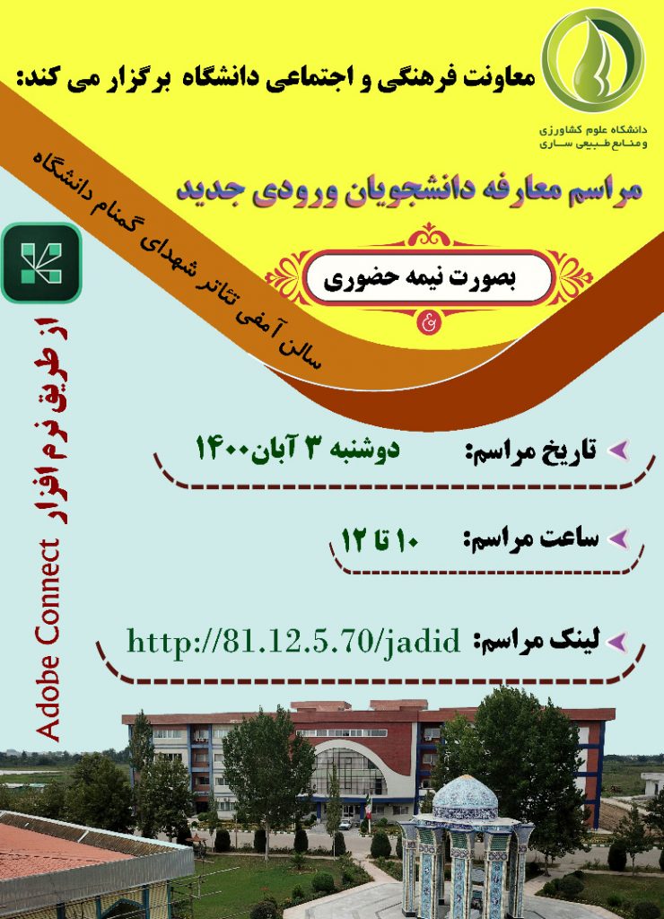 مراسم دانشجویان جدیدالورود، سوم آبان، دوشنبه ساعت ۱۰ الی ۱۲ با حضور هیات رئیسه محترم دانشگاه به صورت نیمه حضوری ( مجازی و حضور برخی از دانشجویان نوورود) در سالن آمفی تئاتر به میزبانی معاونت فرهنگی و اجتماعی دانشگاه برگزار می گردد.
