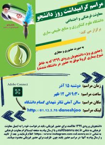 معاونت فرهنگی و اجتماعی دانشگاه علوم کشاورزی و منابع طبیعی ساری برگزار می کند:مراسم روز دانشجو روز دوشنبه ۱۵ آذر به صورت حضوری و مجازی شرکت در مراسم حضوری فقط مخصوص دانشجویان ورودی سال ۱۳۹۹ است که درخواست خود را به ایمیل معاونت فرهنگی و یا در پیچ اینستاگرام معاونت فرهنگی ثبت کرده اند و بعد از تایید میتوانند در سالن آمفی تئاتر دانشگاه حضور یابند.
