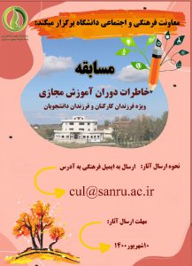 معاونت فرهنگی و اجتماعی دانشگاه مسابقه ای تحت عنوان “خاطرات دوران آموزش مجازی” ویژه فرزندان کارکنان و فرزندان دانشجویان دانشگاه برگزار می کند. علاقه مندان می توانند تا تاریخ ۱۰ شهربور ۱۴۰۰ آثار خود را به ایمیل معاونت فرهنگی ارسال نمایند.