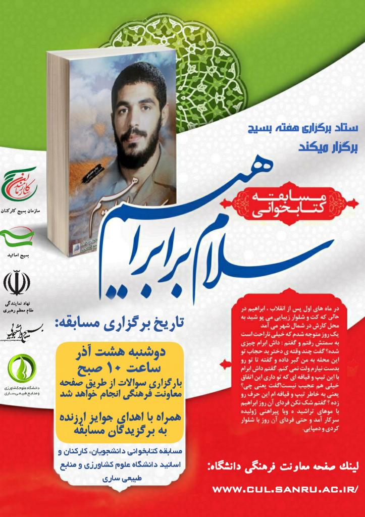 ستاد برگزاری هفته بسیج برگزار میکند: مسابقه کتابخوانی تحت عنوان سلام بر ابراهیم، جهت اطلاعات بیشتر به مندرجات پوستر مراجعه شود.