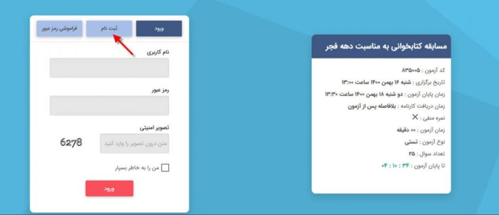 ضمن تبریک فرارسیدن ایام الله دهه فجر و تشکر از شما بابت شرکت در مسابقه کتابخوانی دهه فجر به اطلاع میرساند برای پاسخگویی به سوالات، باید وارد لینک زیر شوید، ثبت نام کنید و سپس به سوالات پاسخ فرمایید.