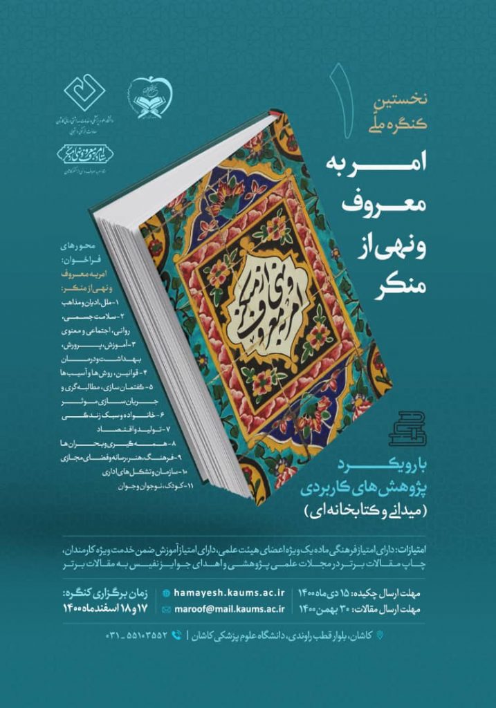 نخسـتین کنگره ملی امربـه معروف و نهی از منکربـا رویکرد پژوهشهـای کـاربردی(میدانی و کتابخانهای) در تاریخ۱۷ و۱۸ اسفندماه سال جاری به میزبانی دانشگاه علوم پزشکی کاشان برگزار می کند.