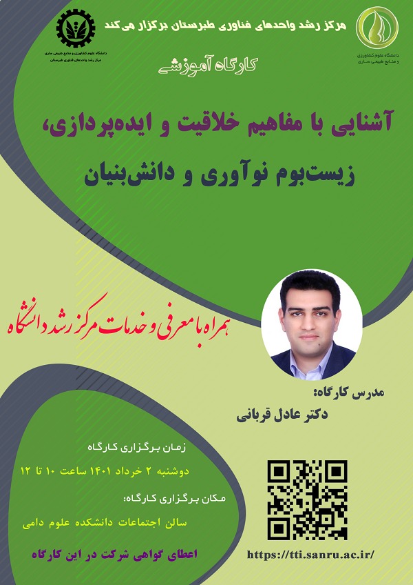 مرکز رشد واحدهای فناور طبرستان (دانشگاه علوم کشاورزی و منابع طبیعی ساری) در نظر دارد تا کارگاه آموزشی “آشنایی با مفاهیم خلاقیت و ایدهپردازی، زیستبوم نوآوری و دانشبنیان” را برگزار نماید.